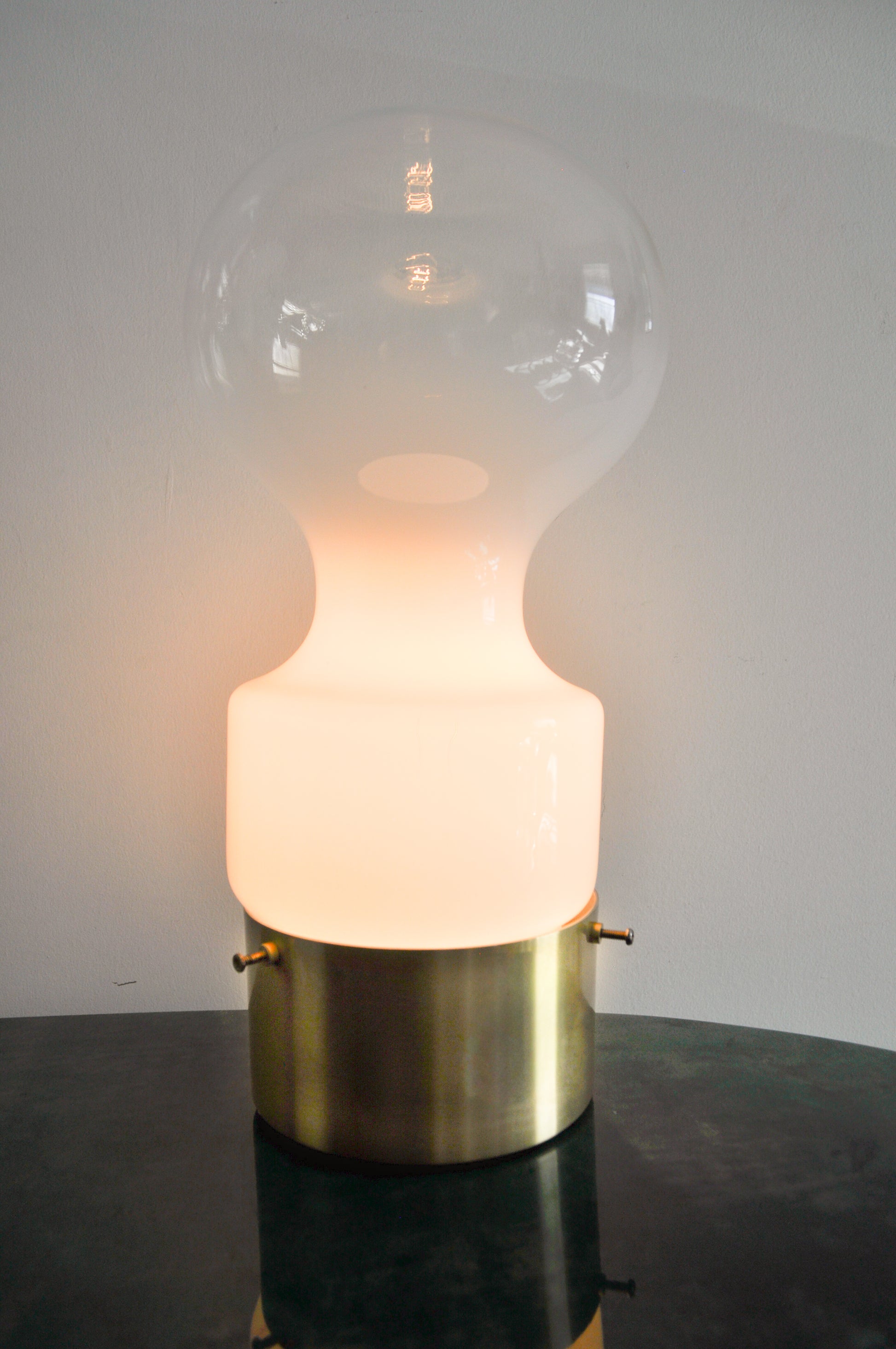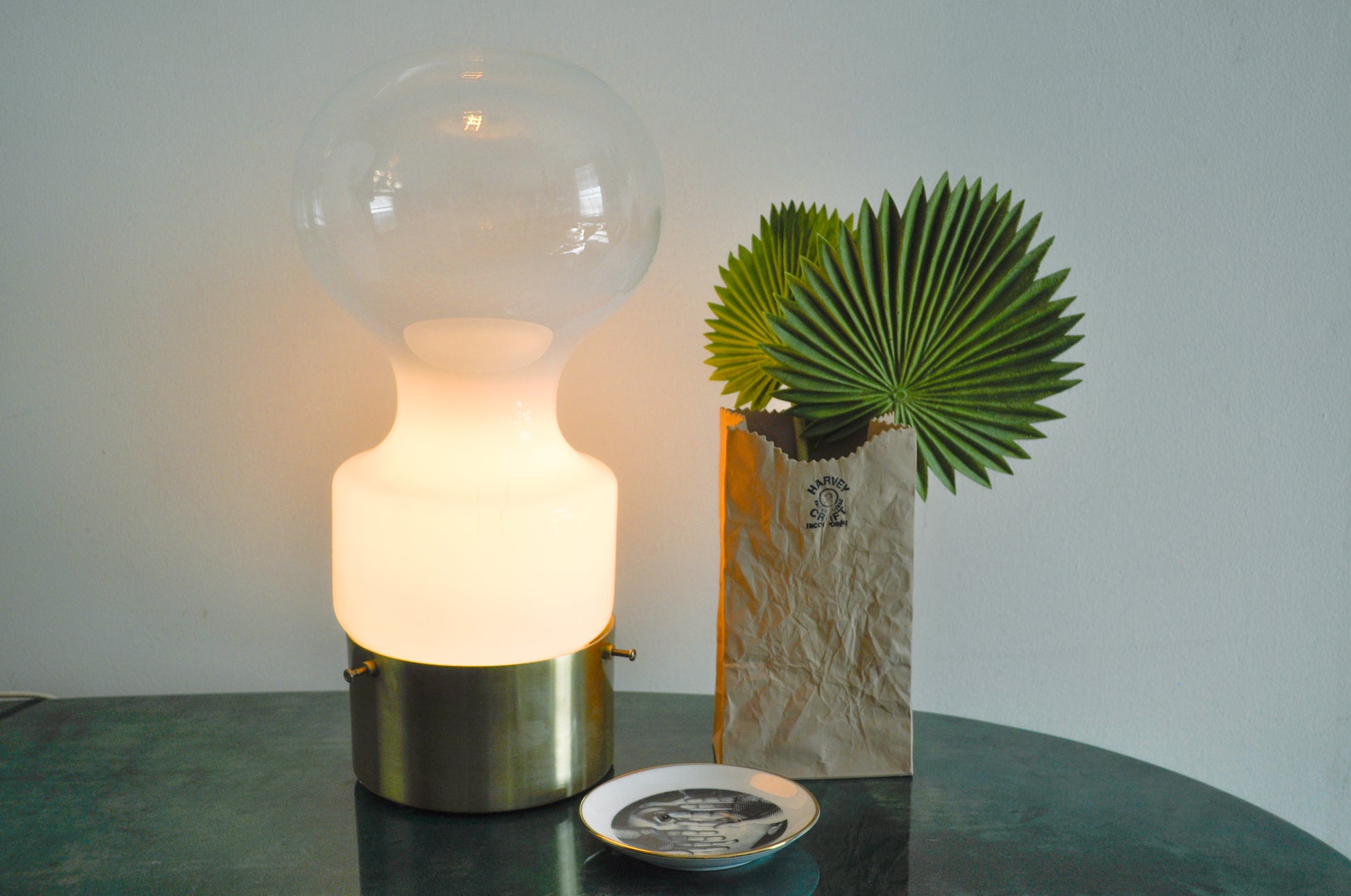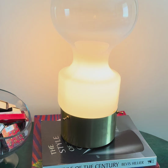 A striking mid-century Raak Amsterdam table lamp from the 1970s, showcasing the brand’s iconic sculptural silhouette featured in their celebrated Weerballonnen and Dauwdruppel series. The handblown glass—crafted in Amsterdam—features a rare and beautiful white-to-clear ombré fade, shifting from opaline white to a transparent dome that creates a warm, atmospheric glow when illuminated. A true statement piece of Dutch mid-century modern lighting design.