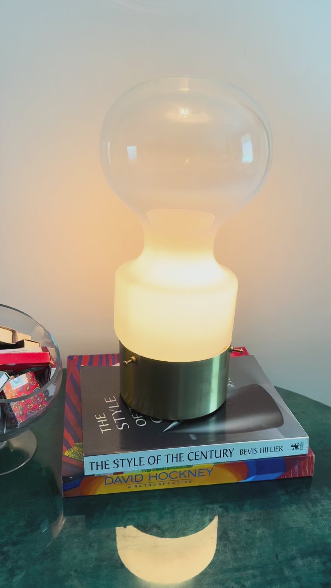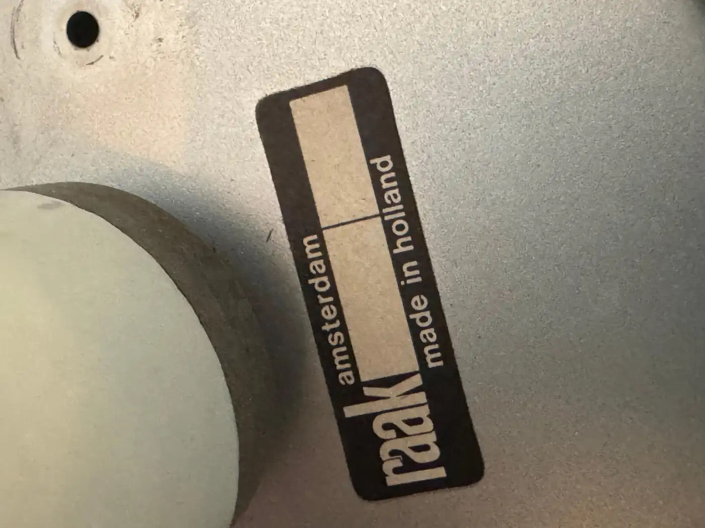 The lamp retains its original Raak components, including the glass and the brushed brass-tone metal base, complete with the authentic Raak “made in Holland” sticker. Expertly adapted as a table lamp with an integrated side switch, it is professionally wired for North American use (120V). Perfect for a nightstand, bookshelf, side table, or any interior seeking a sculptural mid-century accent.
