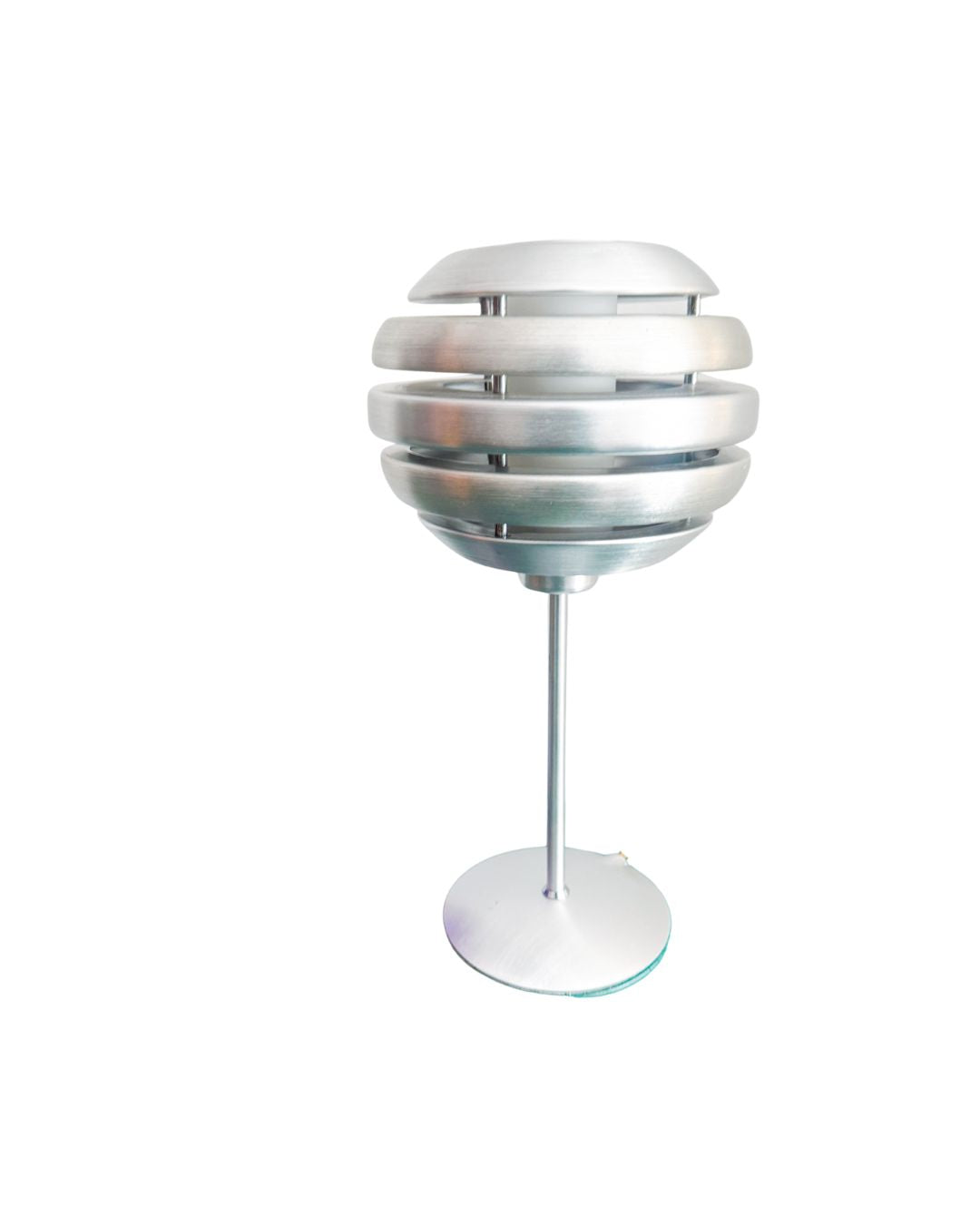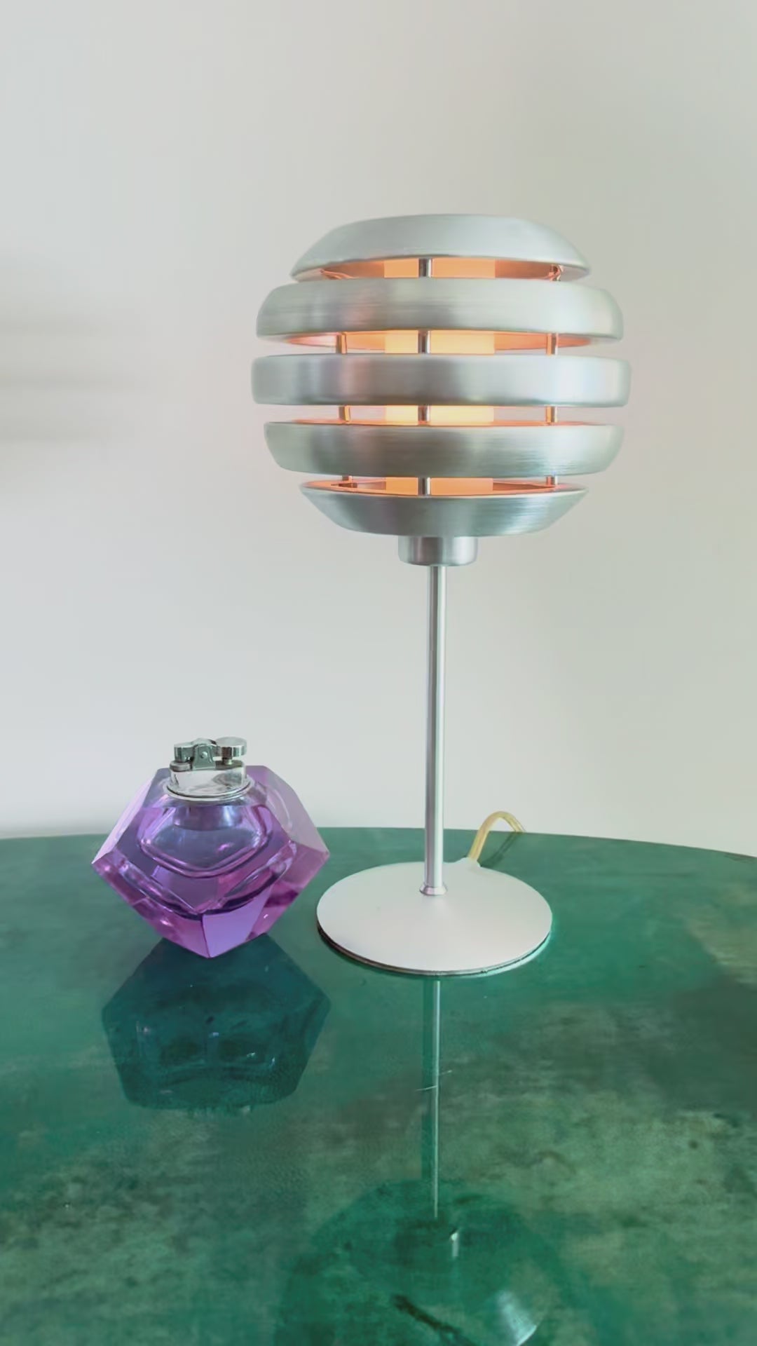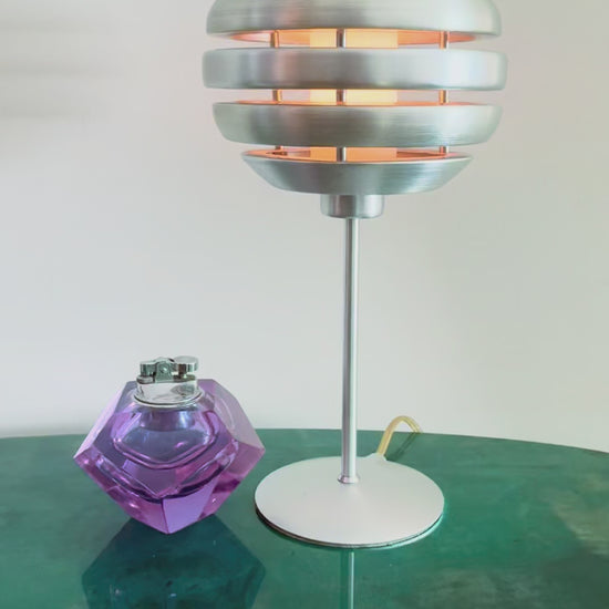 Elegant Mercur table lamp by Austrian lighting brand Eglo, crafted in Austria during the 1990s. This sculptural design features a shade composed of stacked brushed-aluminum rings that beautifully diffuse the light through a white inner diffuser, casting a soft and ambient glow. The combination of its minimalist stem, circular base, and sleek metallic finish reflects the refined Space-Age and Mid-Century Modern influences that define Eglo’s early lighting designs.