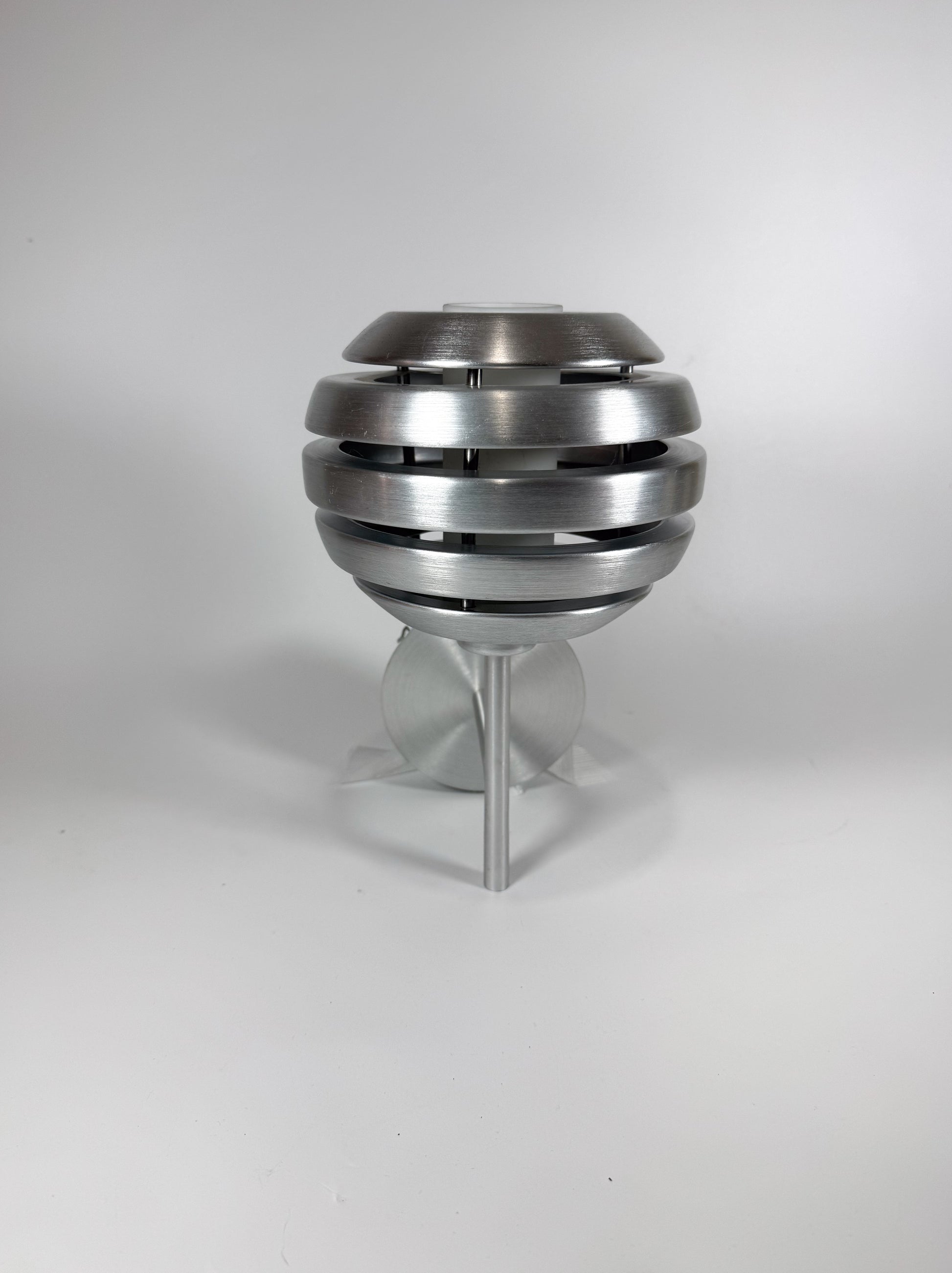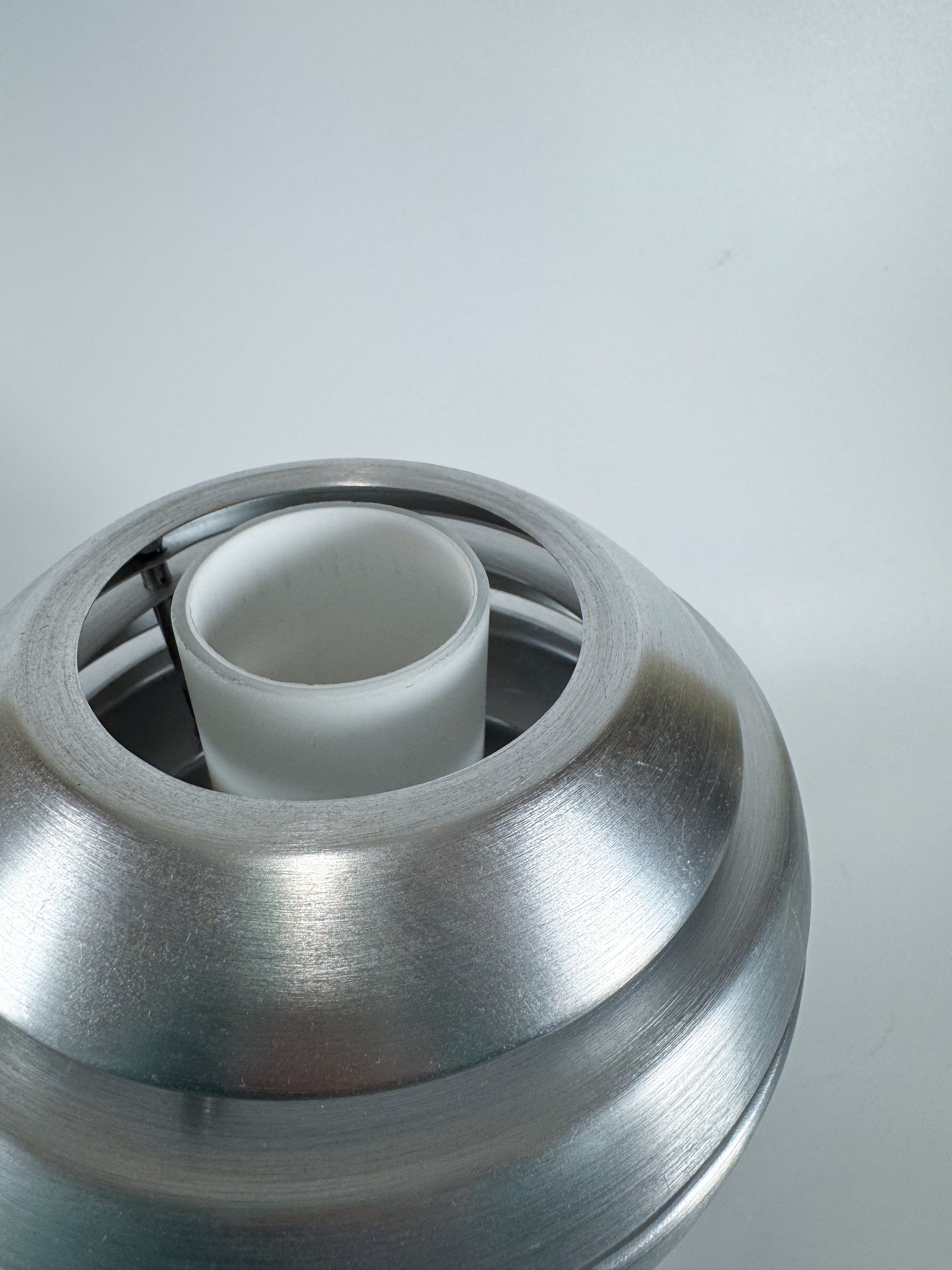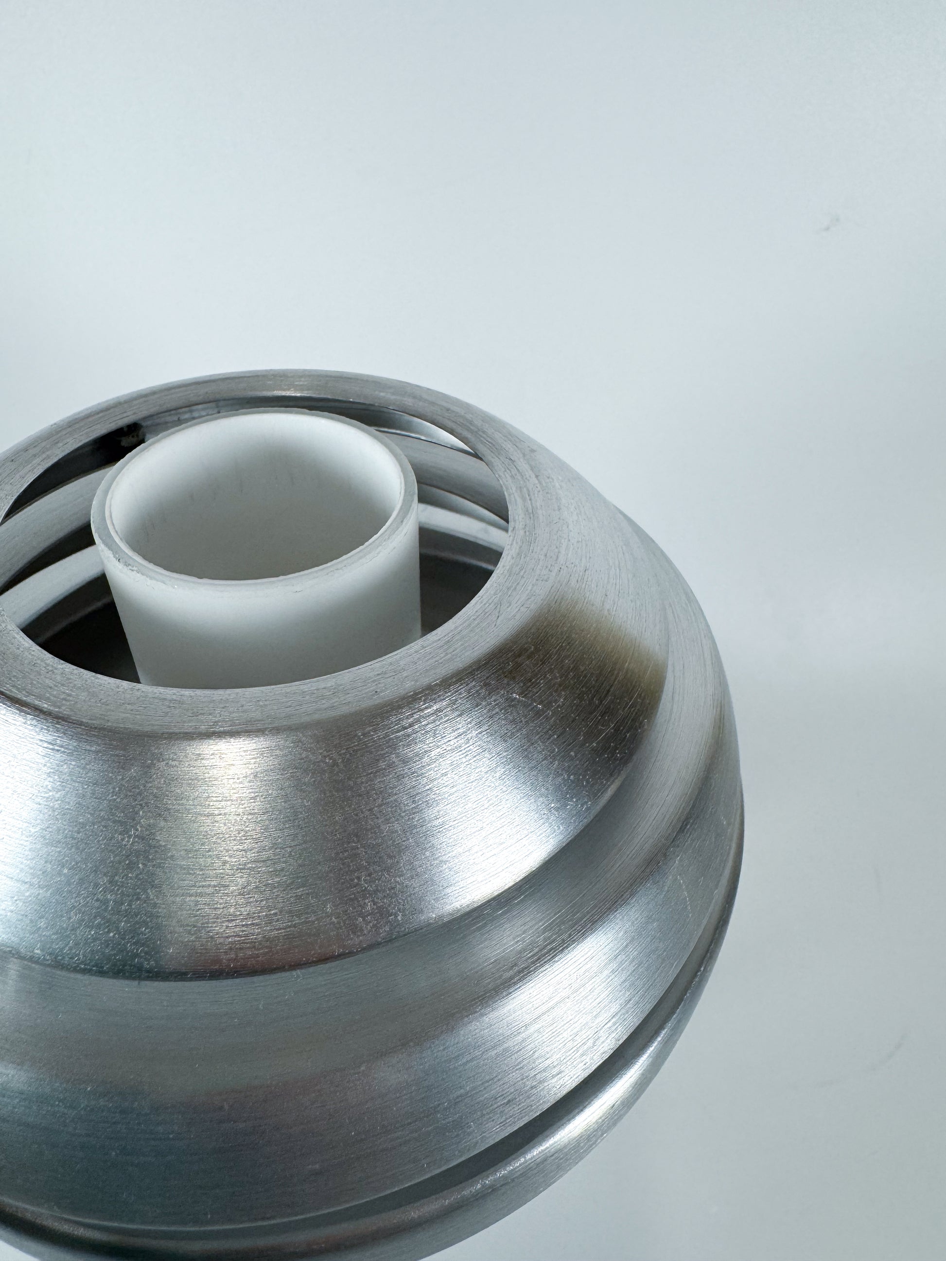Striking Mercur wall sconce by Austrian lighting brand Eglo, designed and produced in the 1990s. This sculptural piece features a brushed-aluminum structure composed of stacked horizontal rings surrounding a frosted white diffuser, creating a soft, atmospheric glow. The clean geometry and metallic finish perfectly embody the Space Age aesthetic of late-20th-century European design — elegant, futuristic, and timeless.
