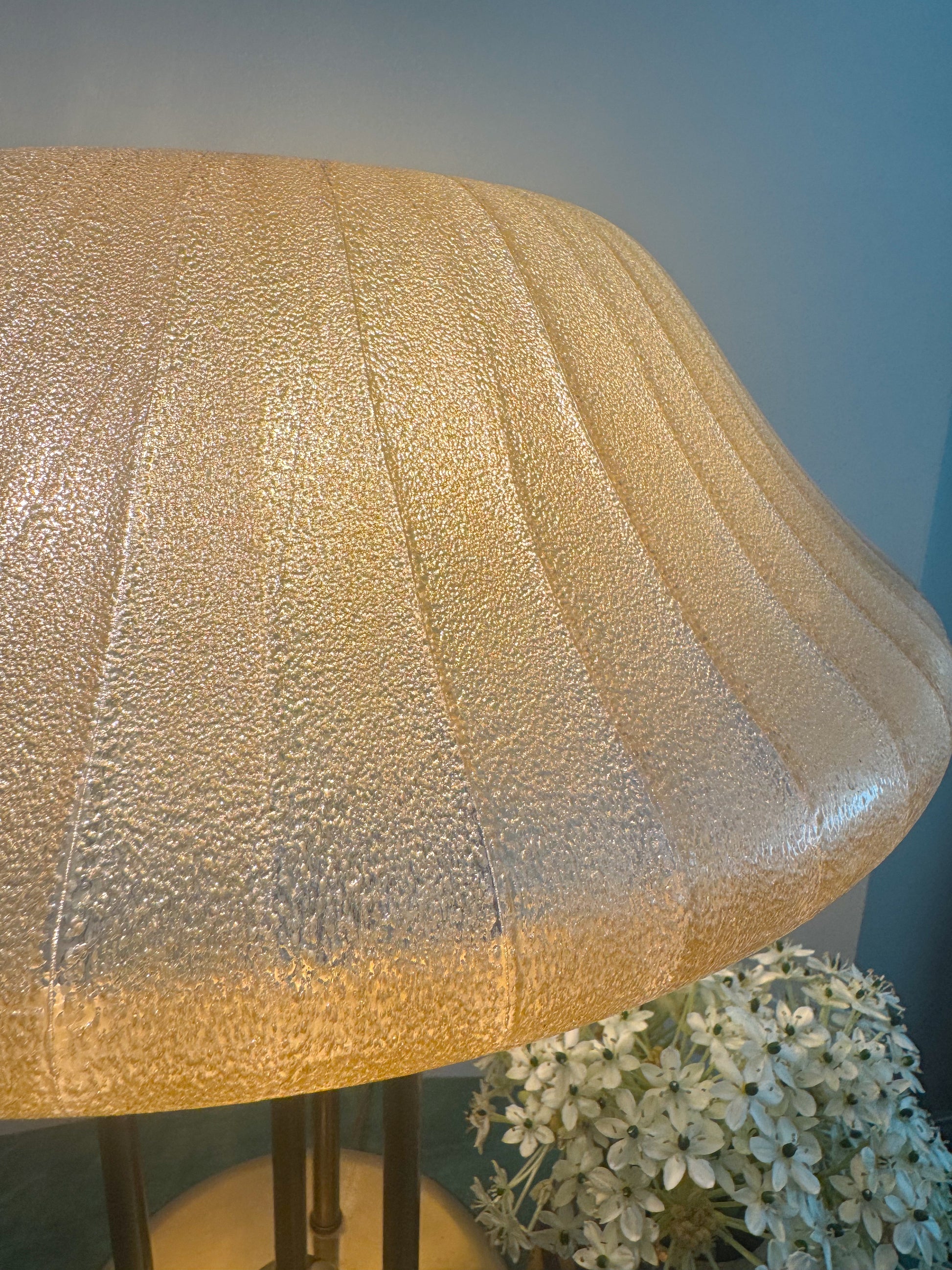 Beautiful vintage table lamp with a rare sculptural design. The shade is made of a textured plastic that gives off a soft, warm glow when lit. There is a small bump on the top, not very noticeable in person — see close-up photos.